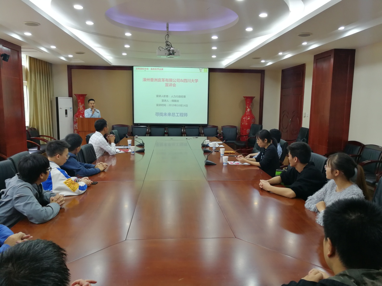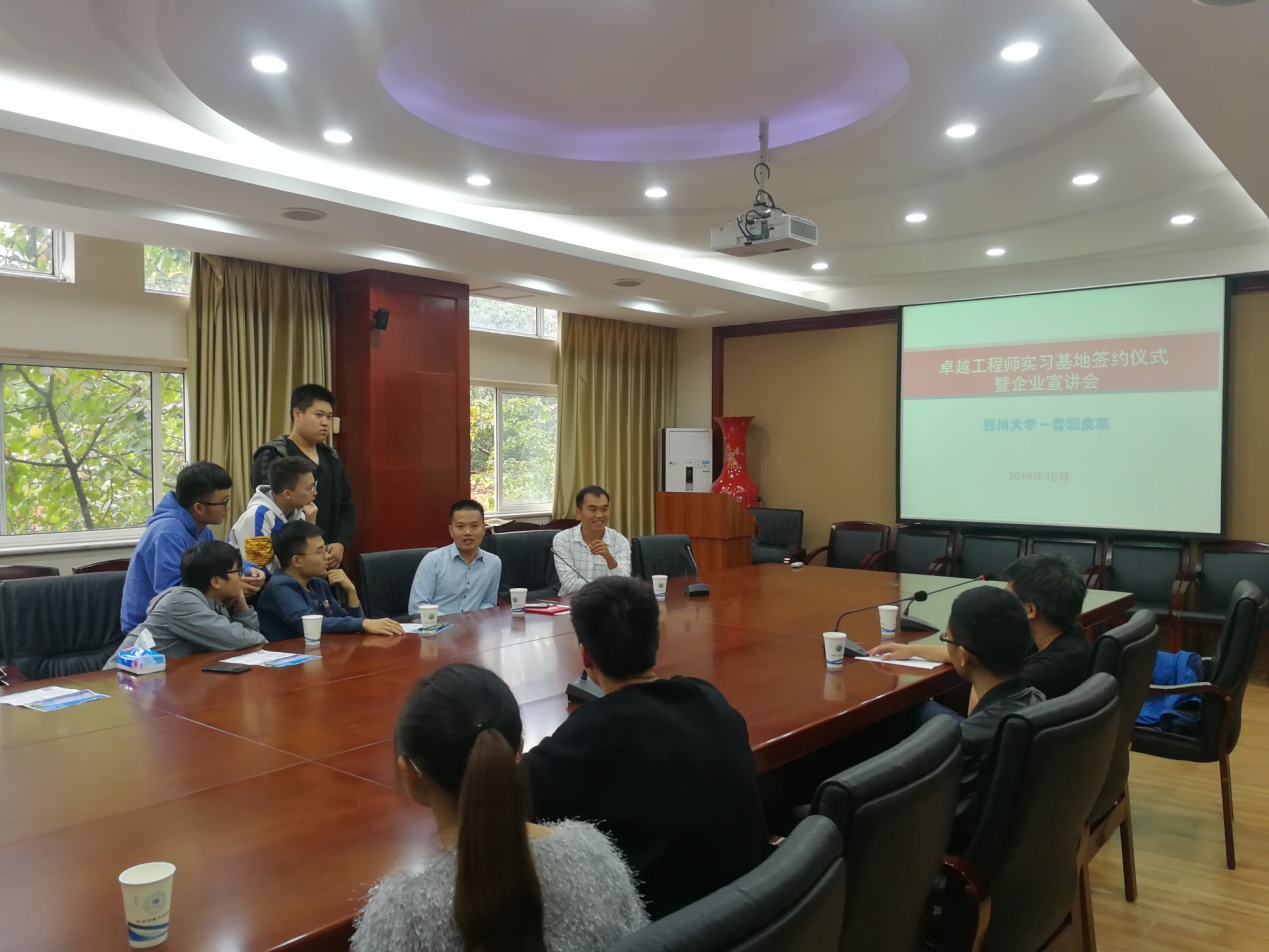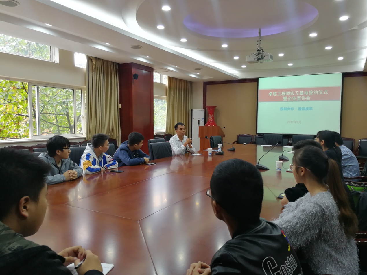 2019年10月14日下午2:30,77779193永利集团轻工科学与工程学院与漳洲香洲皮革有限公司“共建卓越工程师实习基地签字仪式暨企业宣讲会” 在皮革楼209会议室顺利举行。77779193永利集团轻工科学与工程学院副院长彭必雨教授、生物质与皮革工程系系主任林炜教授、皮革工程教研室主任但年华副教授、漳洲香洲皮革有限公司执行副总林汉彬、人力行政部傅国润经理及2016级本科生出席了本次会议。