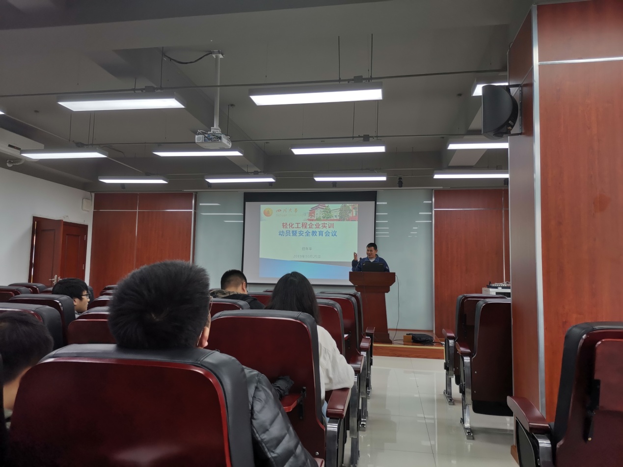 20191025日,轻化工程专业《企业实训》课程实习行前动员暨安全教育会议在皮革楼报告厅顺利举行。皮革工程教研室主任但年华副教授、颜俊高级工程师和2016级修读《企业实训》课程全体本科生参加了本次会议。