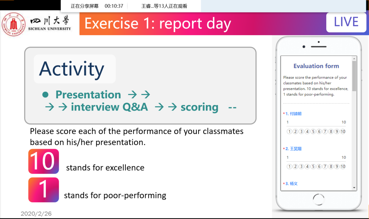 针对学生学习特点,金老师积极关注学生需求,成功构建具有舒适度和安全感的“在线学习社区”,让学生积极参与课堂,逐渐化解学生的交流障碍,进入潜意识的正规场合学习模式。首先,他建立了一套“社区制度”,从政策上鼓励学生全程参与课堂活动。