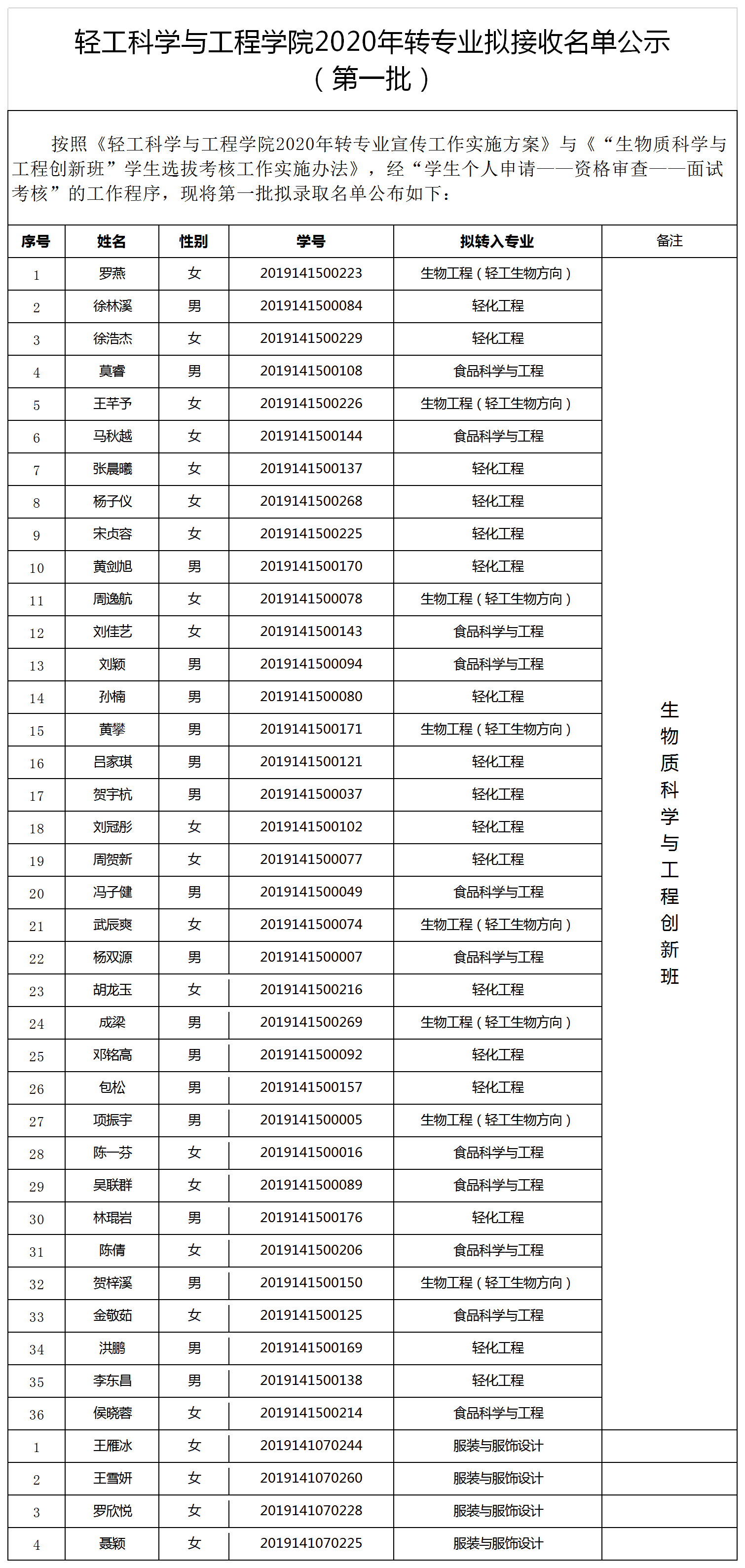 轻工科学与工程学院2020年转专业录取名单公示(第一批)