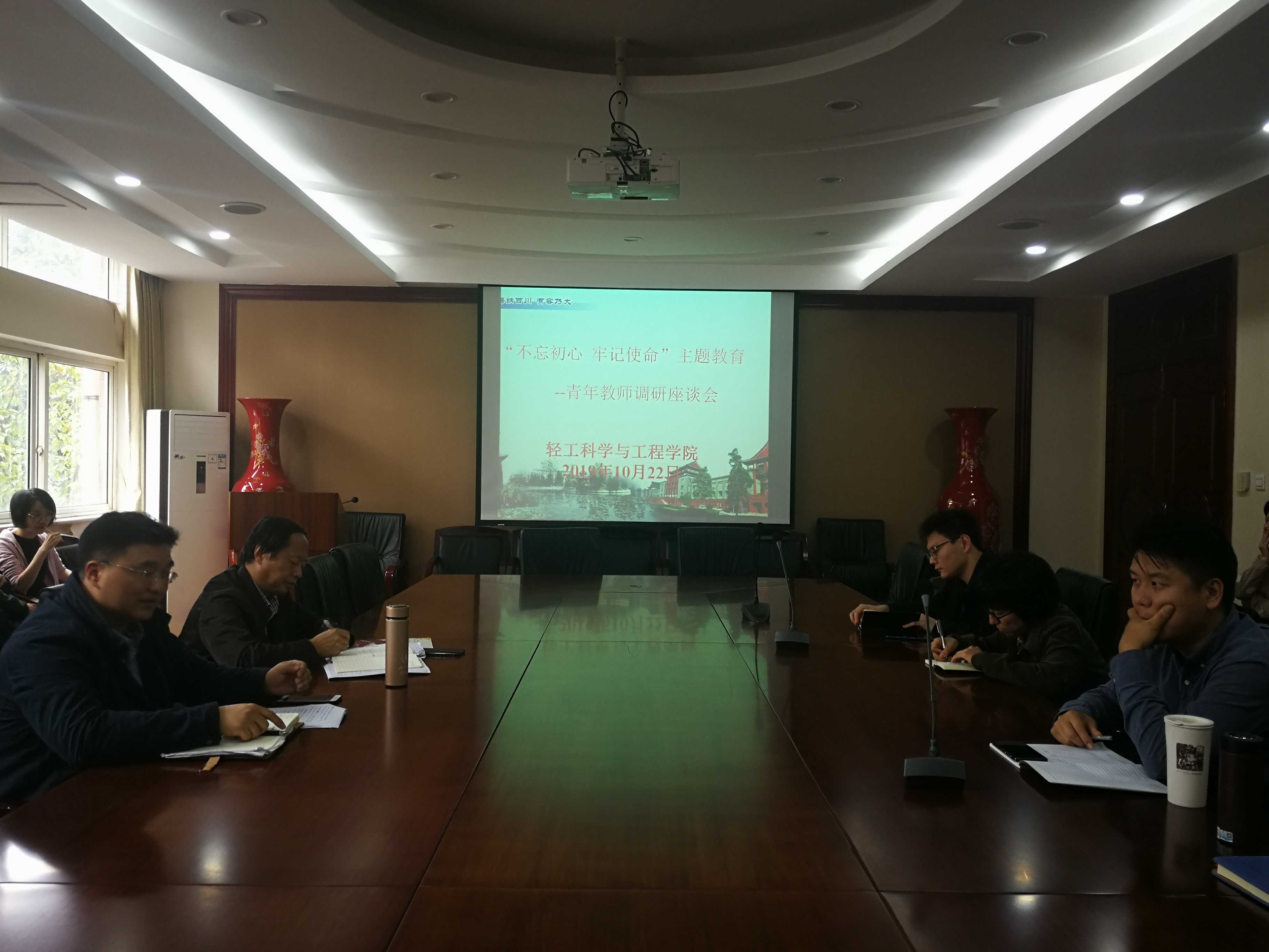 2019年10月22日下午,我院在皮革楼209会议室,召开“不忘初心、牢记使命”主题教育青年教师调研座谈会,党政主要负责人参加本次调研,深入基层认真听取青年教师的意见和建议。