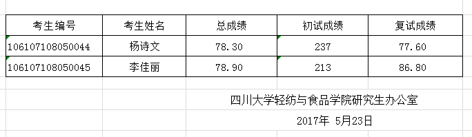 现将轻纺与食品学院2017年博士研究生招生入学成绩进行公示。如有问题或意见,自公示之日起十个工作日内,实名制反映至轻纺与食品学院纪委办公室。邮箱lxhqf@scu.edu.cn,联系电话85461730。此名单不包括非公开招考考生。