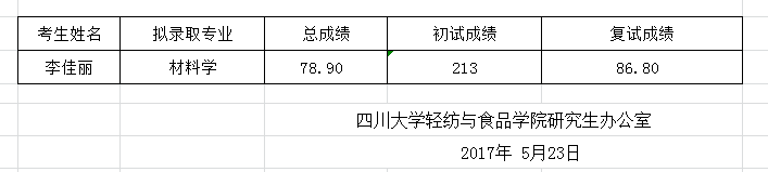 现将轻纺与食品学院2017年博士研究生拟录取名单进行公示。如有问题或意见,自公示之日起十个工作日内,实名制反映至轻纺与食品学院纪委办公室。邮箱lxhqf@scu.edu.cn,联系电话85461730。此名单不包括非公开招考考生。