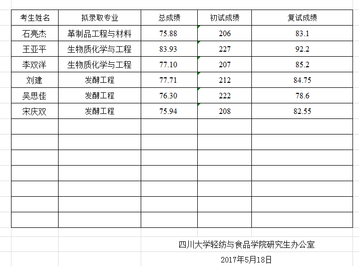现将轻纺与食品学院2017年博士研究生拟录取名单进行公示。如有问题或意见,自公示之日起十个工作日内,实名制反映至轻纺与食品学院纪委办公室。邮箱lxhqf@scu.edu.cn,联系电话85461730。此名单不包括非公开招考考生。