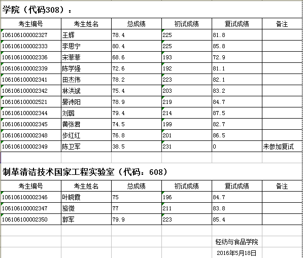 现将轻纺与食品学院2016年博士研究生招生入学成绩进行公示。如有问题或意见,自公示之日起三个工作日内,实名制反映至轻纺与食品学院纪委办公室。邮箱lxhqf@scu.edu.cn,联系电话85461730。此名单不包括3+2+3学生、硕博连读学生和三年级转博学生。