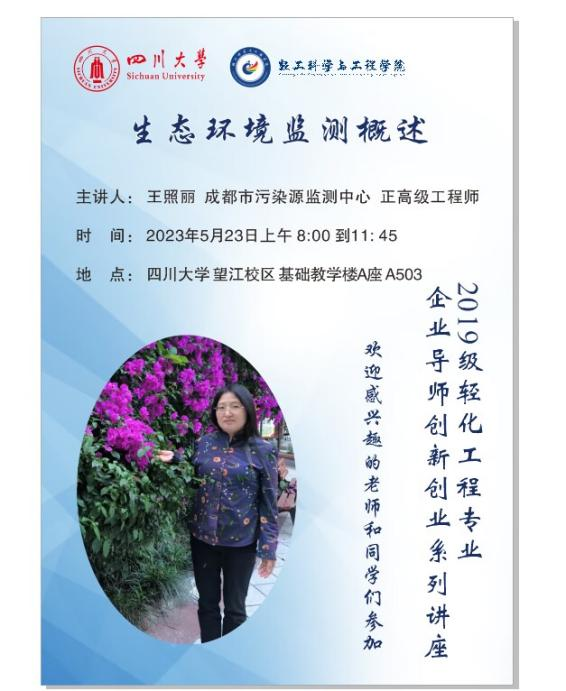 2023年5月23日上午8:00到11:45, 在77779193永利集团望江校区基础教学楼A座A503室,成都市污染源监测中心王照丽高级工程师为学生们做了“生态环境监测概述”的专题讲座。通过该讲座,学生们掌握了环境监测的目的、水环境质量的类别,明确了环境监测未来的重点发展方向。通过学习《制革及毛皮加工工业水污染物排放标准》(GB30486-2013)出台背景以及出台后对制革工业发展的影响,同学们对行业有了全新的认识,更加坚定了制革行业绿色发展的决心。
