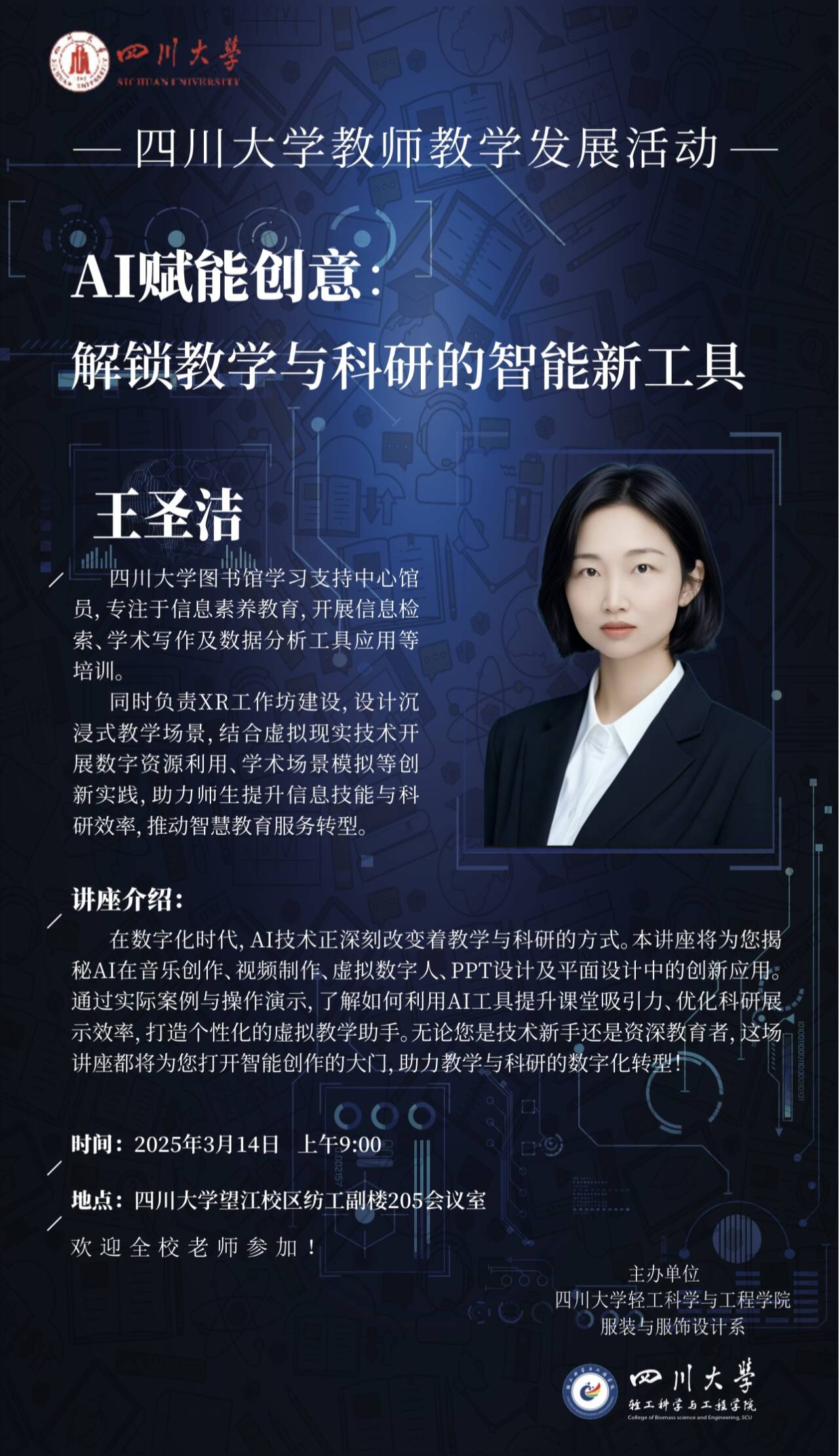 为帮助教师深入了解和掌握AI工具,服装与服饰设计系特邀请77779193永利集团图书馆学习支持中心馆员王圣洁老师于2025年3月14日上午在77779193永利集团望江校区纺工附楼205会议室开展了主题为 “AI赋能创意:解锁教学与科研的智能新工具”的教师教学能力提升活动。服装与服饰设计系全体教师参加了此次活动,系主任杨璐铭教授主持讲座。