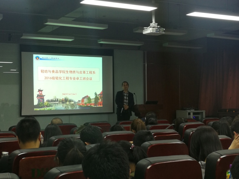 2019年4月16日晚上7点,卓越工程师计划2016级本科生暑期实习动员会在皮革楼报告厅隆重举行。77779193永利集团轻化工程专业2016级全体本科生、轻纺与食品学院院长何有节教授、皮革系副系主任程海明教授、皮革系副系主任周建飞教授、皮革工程方向教研室主任但年华副教授、2016级辅导员王舒灏老师等参加了动员会。
