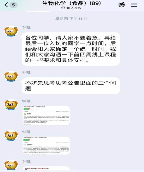 从检查情况来看,全院线上教学秩序总体良好,全院师生认真做好了新学期的各项开课准备,能以良好的精神面貌贯彻教与学的要求。任课教师提前做好了线上授课准备工作,如提前建好课程群、上传学习要求、教学大纲、电子教材、授课方式、课程考核方式等内容、建好SPOC课程等。上课时,任课老师采用多种形式的线上教学方式,上课时间老师发起了签到、调查问卷和讨论,师生进行有效互动,学生参与积极。有些课程紧跟社会热点问题,激发学生的学习热情,从而提高教学效果。如“生物化学”课程将目前新冠病毒的结构和功能融入了教学内容,对学生是非常好的教学素材,有利于引导学生的学习兴趣和对专业的热爱。