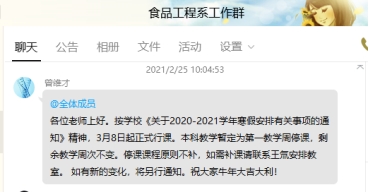 正式行课前,本科教务员通过短信、QQ群等方式多次提醒任课老师做好上课准备。并通知各系教学系主任、教研室主任开展自查,督促任课老师做好新学期教学准备工作。学生辅导员及时统计学生到校情况,督促学生做好上课准备,学院本科教务员将不能按时返校的学生信息发送给相关课程老师,提醒老师做好相关学生的线上教学安排。