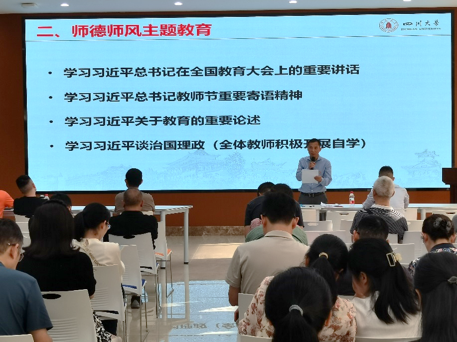 9月19日下午,轻工科学与工程学院在望江校区皮革楼工业互联网中心开展“以教育家精神铸魂强师,谱写教育强国建设华章”主题的师德建设宣传月活动。学院领导班子及全体教职工参加,活动由学院党委书记李天富主持。